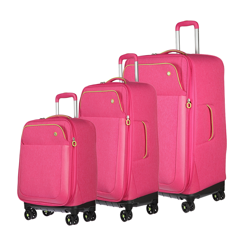 Комплект состоит из трёх чемоданов высотой 55, 69, 77 см, объёмом 46, 91, 121 л. и весом 2.6, 3.1, 3.8 кг. Все модели закрываются по периметру на двухстороннюю молнию, оснащены верхней ручкой, четырьмя колёсиками с поворотом на 360°, внутренним отделом для одежды и двумя карманом на молнии, снаружи на передней стенке два кармана на молнии, возможность увеличения чемодана на 20% (за счет наружней молнии), встроенный кодовый замок TSA