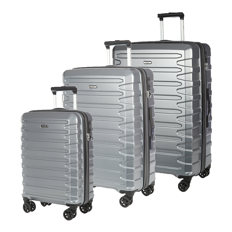 Комплект состоит из трёх чемоданов высотой 81, 69, 59 см, объёмом 127, 85, 53 л, и весом 5.3, 4.2, 2.75 кг