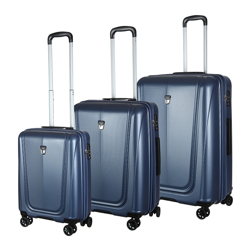 Комплект состоит из трех чемоданов высотой 74, 65, 55 см, весом 4,680, 3,875, 3,015 кг. Все модели закрываются по периметру на двухстороннюю молнию, оснащены верхней ручкой, прорезиненными бесшумными колесами с поворотом на 360°, внутренним отделом для одежды и карманом на молнии, возможность увеличения объёма чемодана на 20% (за счёт молнии), встроенный кодовый замок TSA, максимальная высота выдвижной ручки 40, 45, 59 см.