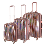 Комплект состоит из трех чемоданов высотой 76, 66, 55 см, весом 4,075, 3,835, 2,865 кг. Все модели закрываются по периметру на двухстороннюю молнию, оснащены верхней ручкой, прорезиненными бесшумными колесами с поворотом на 360°, внутренним отделом для одежды и карманом на молнии, возможность увеличения объёма чемодана на 20% (за счёт молнии), встроенный кодовый замок TSA, максимальная высота выдвижной ручки 34, 43, 55 см.