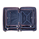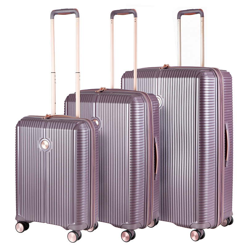 Комплект чемоданов сиреневого цвета, коллекция: Verage «Rome». Выполнен из полипропилена, материал чрезвычайно прочный и долговечный. Все модели оснащены двойной молнией безопасности, что препятствует вскрытию багажа. Внутренним отделом максимальной вместимости с перекрёстными лямками и разделителем для одежды, возможностью увеличения объёма кабины чемодана во всех размерах (функцией невидимого расширения). Выдвижной телескопической ручкой с фиксатором и регулировкой в нескольких положениях, верхней и боковой ручками для удобного подъёма и переноски. Бесшумными колёсами с поворотом на 360°, кодовым замком TSA. Комплект состоит из трёх размеров: 19*(S) (55-38-20 см. 2,500 кг), 24*(M) (66-44-27 см. 3,500 кг), 28*(L) (77-51-31 см. 4,400 кг).