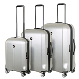 Комплект серебристых чемоданов из поликарбоната - материала чрезвычайно прочного, долговечного и легкого. Коллекция: Verage «Houston». Все модели оснащены двойной молнией безопасности, что препятствует вскрытию багажа. Внутренним отделом максимальной вместимости с перекрёстными лямками и разделителем для одежды, возможностью расширения кабины чемодана во всех размерах (функцией невидимого расширения). Выдвижной телескопической ручкой с фиксатором и регулировкой в нескольких положениях, верхней и боковой ручками для удобного подъёма и переноски (в размере M,L). Бесшумными двойными колёсами с поворотом на 360°, кодовым замком TSA. Комплект состоит из трёх размеров.