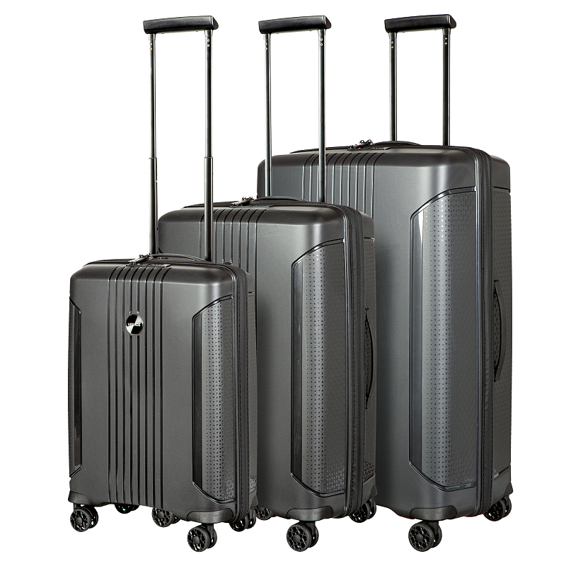 Комплект состоит из трёх чемоданов высотой 77, 67, 55 см. Из прочного полипропиленового материала. Все модели закрывается по периметру на двухстороннюю молнию, оснащёны верхней и боковой ручкой, четырьмя колёсиками 360°. Внутри два отдела для одежды, закрываются на молнию, одна техническая молния с бегунком. Возможность увеличения чемодана на 20% (за счет скрытой молнии), встроенный кодовый замок TSA. Вес: 9 кг.