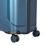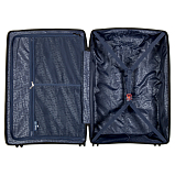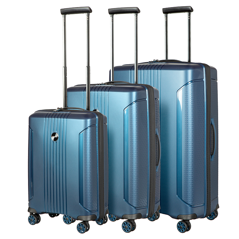 Комплект состоит из трёх чемоданов высотой 77, 67, 55 см. Из прочного полипропиленового материала. Все модели закрывается по периметру на двухстороннюю молнию, оснащёны верхней и боковой ручкой, четырьмя колёсиками 360°. Внутри два отдела для одежды, закрываются на молнию, одна техническая молния с бегунком. Возможность увеличения чемодана на 20% (за счет скрытой молнии), встроенный кодовый замок TSA. Вес: 9 кг.