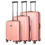 Комплект состоит из трёх чемоданов высотой 77, 67, 55 см. Из прочного полипропиленового материала. Все модели закрывается по периметру на двухстороннюю молнию, оснащёны верхней и боковой ручкой, четырьмя колёсиками 360°. Внутри два отдела для одежды, закрываются на молнию, одна техническая молния с бегунком. Возможность увеличения чемодана на 20% (за счет скрытой молнии), встроенный кодовый замок TSA. Вес: 9 кг.
