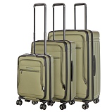 Комплект чемоданов зеленого цвета из полиэстера.Выполнен из полиэстера, устойчив к царапинам и воде. Все модели оснащены двойной молнией безопасности, что препятствует вскрытию багажа. Расширяемый: 24-28" с экспандером,материал передняя часть: полиэстер 150D с ПУ-покрытием на поверхности, задняя часть: PP.Подкладка 210D с ПУ-покрытием. Ручка верхняя и боковая ручки из пластика (на 19" без боковой ручки), черного цвета, пластик. Основная молния 08 черного цвета, молния 07 для переднего кармана в цвете корпуса. Встроенный замок TSA с комбинацией, черного цвета. Тележка внутри алюминиевая, снаружи тележка из железа с черным покрытием, пластик черного цвета. Двойные колеса, пластик черного цвета с ободом в цвете корпуса. Фурнитура выполнена из экологичного материала, для чемоданов использовали переработанных пластиковых бутылок. 19“:36*21*55см/2.9кг/34л