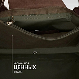 Внутри одно большое отделение, в котором расположен кармашек для мелких предметов. Закрывается на молнию и на клапан на кнопке. Компактно складывается до размеров 13 х 23 см. Оснащена съёмным плечевым ремнём.