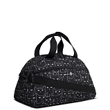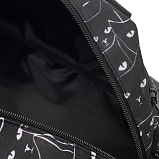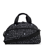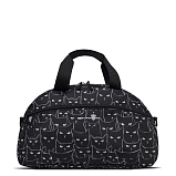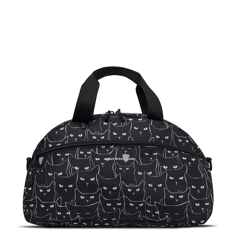 Вместительная чёрная дорожная сумка из плотного текстиля с изображением котов. Внутри просторное отделение для одежды на молнии. Снаружи с обеих сторон продольные карманы на молниях. Оснащена двумя удобными верхними ручками и регулируемым съёмным плечевым ремнём. Размеры: 25 x 40 x 20 см.