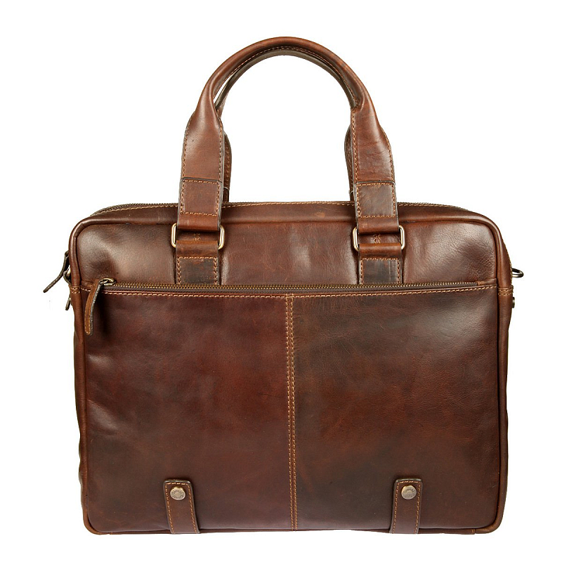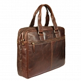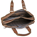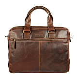 Мужская деловая сумка с 2 отделениями на молнии, независимыми друг от друга. Изготовлена из плотной, гладкой кожи. Внутри 1 отделения карман для ноутбука, фиксируется клапаном на липучке, во 2 отделение карман на молнии для документов, мобильного телефона, других мелочей. В качестве материала для внутренней части используется текстиль. Снаружи на передней и задней стенках карманы на молнии. Оснащена ручками, съёмным регулируемым плечевым ремнём на карабинах. Размеры: 30,5 х 40 х 9 см.