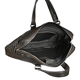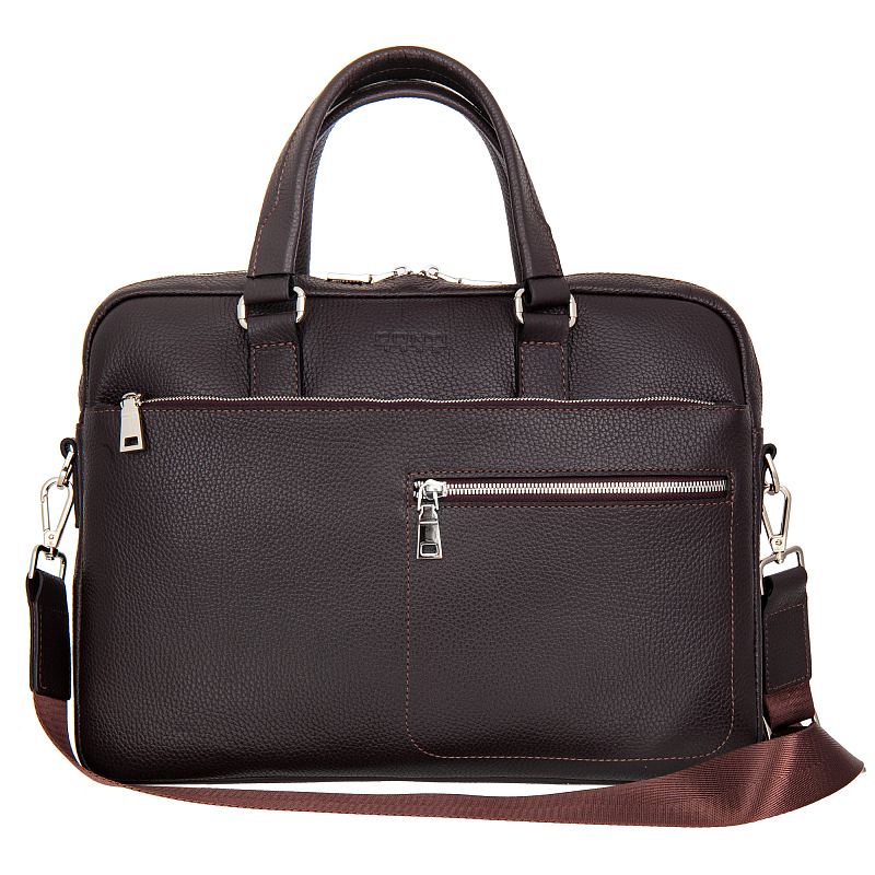 Сумка из натуральной кожи темно-коричневого цвета, закрывается на двухстороннюю молнию, Внутри один основной отдел, отделение для планшета на липучке, карман для документов на молнии, два кармашка для мелких предметов. Снаружи на лицевой стенке два кармана на молнии. Оснащена съёмным регулируемым плечевым ремнём на карабинах.
