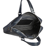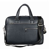 Сумка из натуральной кожи синего цвета, закрывается на двухстороннюю молнию, Внутри один основной отдел, отделение для планшета на липучке, карман для документов на молнии, два кармашка для мелких предметов. Снаружи на лицевой стенке два кармана на молнии. Оснащена съёмным регулируемым плечевым ремнём на карабинах.
