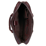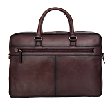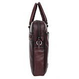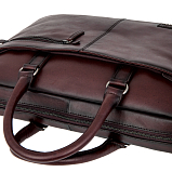 Бизнес-сумка темно-коричневого цвета из натуральной кожи. Сумка закрывается на молнию, внутри одно главное отделение, в котором расположены: карман для документов на липучке. Один карман для мелких предметов на молнии, прозрачный кармашек для пропуска, карман для мелких предметов, три держателя для авторучки. С внешней стороны на лицевой стенке расположены два кармана на молниии, на тыльной задней стенке - отдел на молнии. Сумка оснащена съёмным регулируемым плечевым ремнём на карабинах.