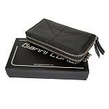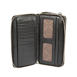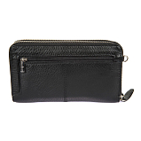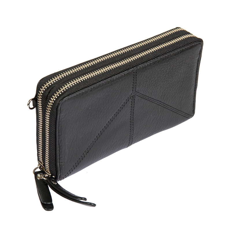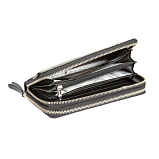 Внутри два отделения, закрывающихся на молнию по периметру. В первом расположены четыре отделения для купюр, карман для монет на молнии, два кармана для документов, два сетчатых кармана и восемь кармашков для пластиковых карт. Во втором отделении три кармана для документов, сетчатый карман, два кармана для документов или купюр и девять кармашков для пластиковых карт. С внешней стороны на задней стенке расположен карман на молнии. Портмоне оснащено съёмным ремешком на карабине на запястье.