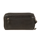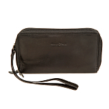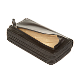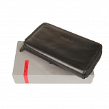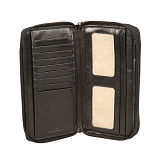 Внутри два отделения. В первом отделении расположены три кармана для документов, два сетчатых кармана и девять кармашков для пластиковых карт. Во втором отделении карман для монет на молнии, четыре кармана для документов, два сетчатых кармана, восемь кармашков для пластиковых карт и два отделения для купюр. Отделения закрываются на молнию. Портмоне оснащено съёмным ремешком на запястье.