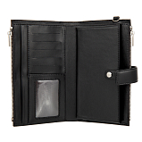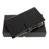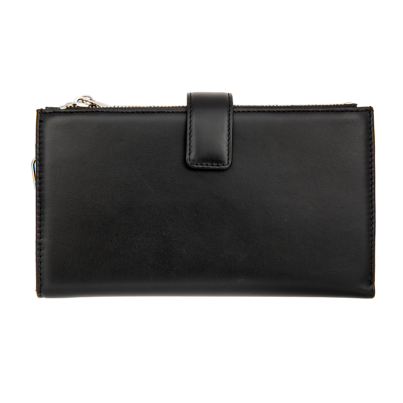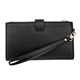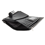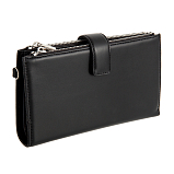 Чёрный кожаный клатч с функцией кошелька. Внутри два продольных кармана на молниях, глубокое отделение для купюр, отдел для мобильного телефона на кнопке, два кармана для документов и шесть кармашков для пластиковых карт. Раскладывается пополам, закрывается хлястиком на кнопке, оснащён съёмным ремешком на запястье. Цвет фурнитуры - серебро. Товар упакован в подарочную коробку от бренда Sergio Belotti.