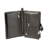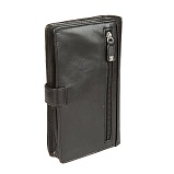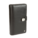 Мужской кожаный клатч чёрного цвета. Внутри одно основное отделение, четыре кармана на молнии, восемнадцать кармашков для пластиковых карт, один потайной карман и открытый кармашек для мелких предметов. На задней стенке карман на молнии. Закрывается клапаном на замок, оснащён выдвижным кожаным ремешком на запястье.