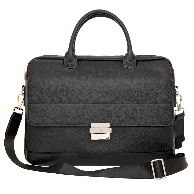 Портфель от итальянского бренда Sergio Belottiиз из натуральной кожи, закрывается на молнию, Внутри один основной отдел, отделение для планшета на липучке, карман для документов на молнии, два кармашка для мелких предметов. Снаружи на лицевой стенке карман который закрывается на замок. На спинке сумки расположен один карман на молнии. Сумка оснащена съёмным регулируемым плечевым ремнём на карабинах (75 см). Размеры: 28 х 40 х 14 см.