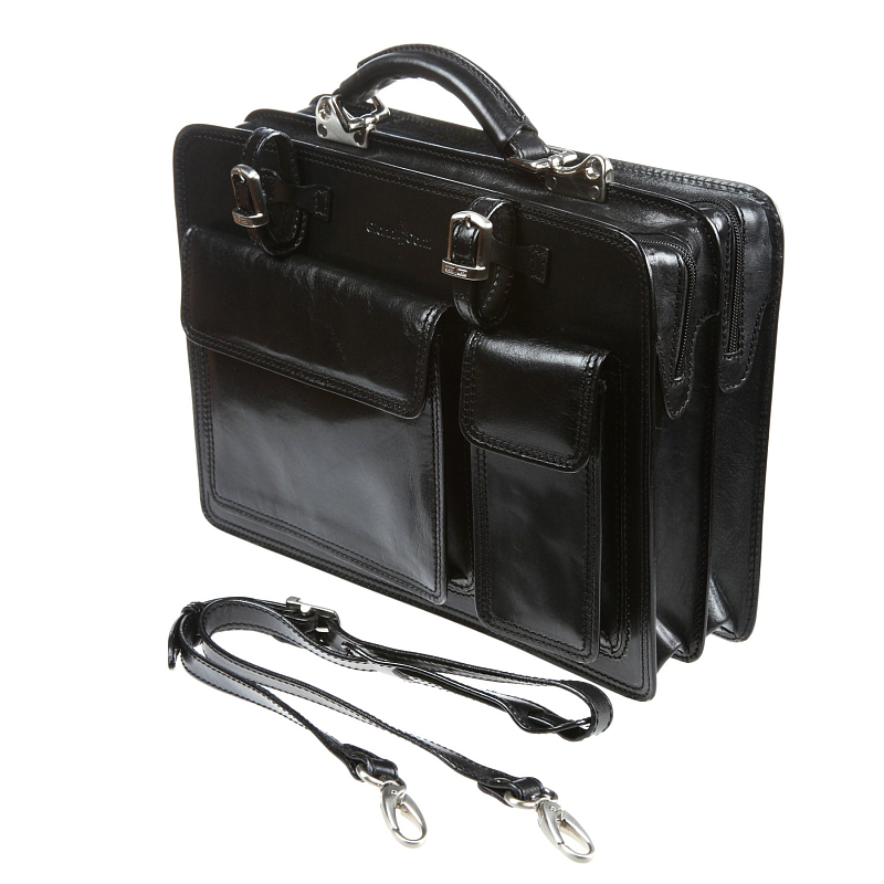 На задней стенке внешней стороны портфеля имеется карман для документов на молнии. На лицевой стенке карман для мобильного телефона на магнитной кнопке и карман для документов на магнитной кнопке. Также на лицевой стенке имеется зажим для зонта. Два основных отделения закрываются на молнии. В одном отделении карман для документов на молнии, в другом карман для мобильного телефона, три кармашка для пластиковых карт и два держателя для авторучек. Портфель оснащён съёмным регулируемым плечевым ремнём на карабинах.