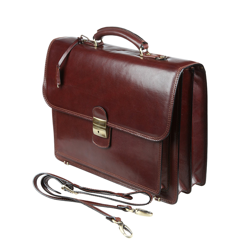 Портфель закрывается на клапан с замком на ключ. С внешней стороны на задней стенке расположен карман на молнии. На лицевой стенке имеется карман для бумаг. Внутри два больших отделения, между которыми отделение на молнии. В одном отделении имеются карман на молнии, два держателя для авторучек, три кармашка для пластиковых карт и карман для мобильного телефона. Портфель оснащён съёмным регулируемым плечевым ремнём на карабинах.