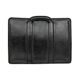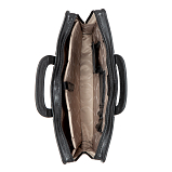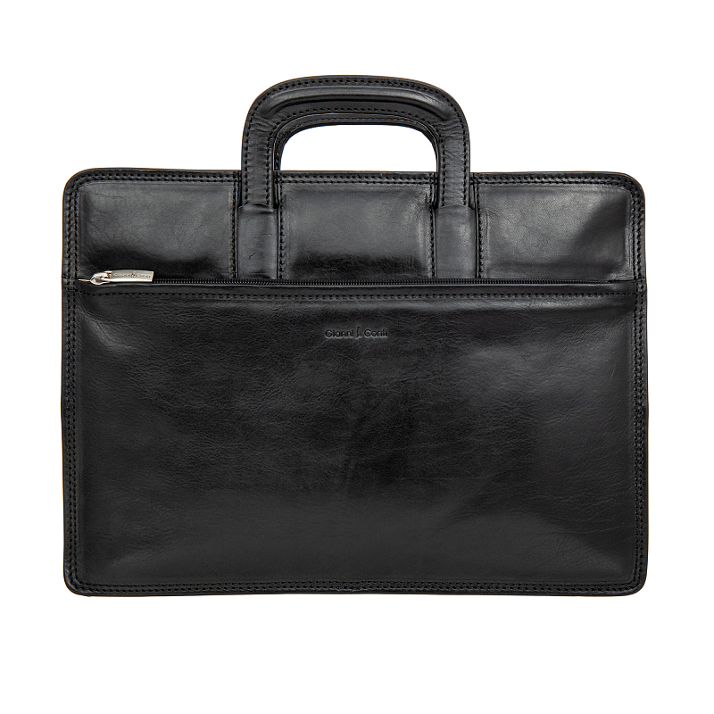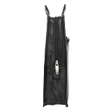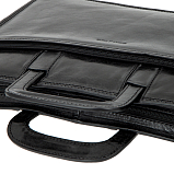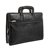 Портфель закрывается на молнию. С внешней стороны на лицевой стенке расположен карман для документов на молнии. Внутри одно большое отделение. В отделении расположены карман для мобильного телефона, три кармашка для пластиковых карт, два отделения для ручек и большой карман для бумаг. Портфель оснащён двумя выдвижными ручками.