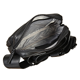 Сумка закрывается на молнию. Внутри одно отделение, в котором два кармана один на молнии. С фронтальной стороны есть карман на молнии. С тыльной стороны, имеется потайное отделение на молнии. Оснащена регулируемым ремнем.