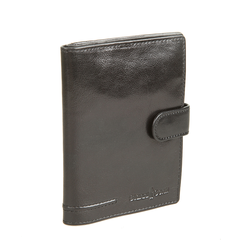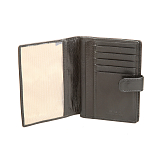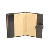 Внутри два отделения. В первом отделении на правой стороне расположены кожаный карман, состоящий из пяти кармашков для пластиковых карт, и два потайных кармана, на левой стороне сетчатый карман. Во втором отделении расположены два кожаных кармашка на обеих сторонах. Закрывается клапаном на кнопке.