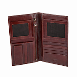 На внешней стороне обложки располагается большой сетчатый карман. На правой внутренней стороне большое отделение для документов, потайной карман, сетчатый карман и пять кармашков для пластиковых карт. На левой большое отделение на молнии, большой карман для купюр, два потайных кармашка, отделение для монет на кнопке, сетчатый карман и четыре кармашка для пластиковых карт.