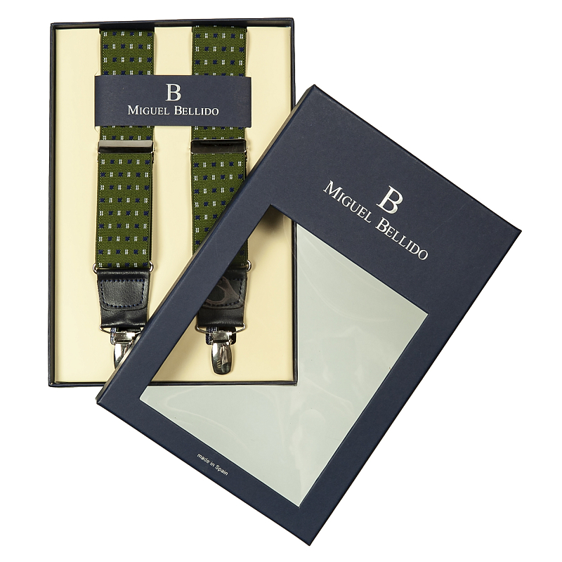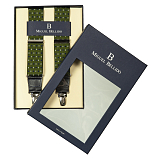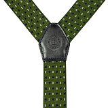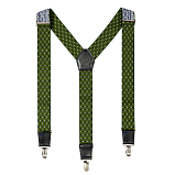Подтяжки мужские широкие с металлическими клипсами с кожаной отделкой. Регулируются с помощью специального зажима, который перемещается на необходимую длину каждой полосы.