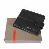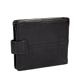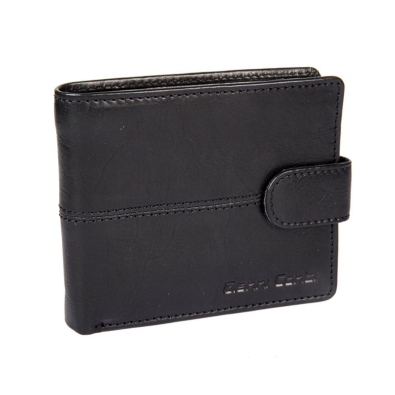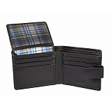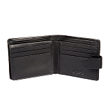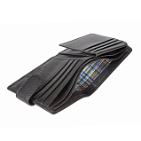 Внутри портмоне три отделения для купюр, девять кармашков для пластиковых карт, два потайных кармашка и сетчатый карман. Закрывается клапаном на кнопке.