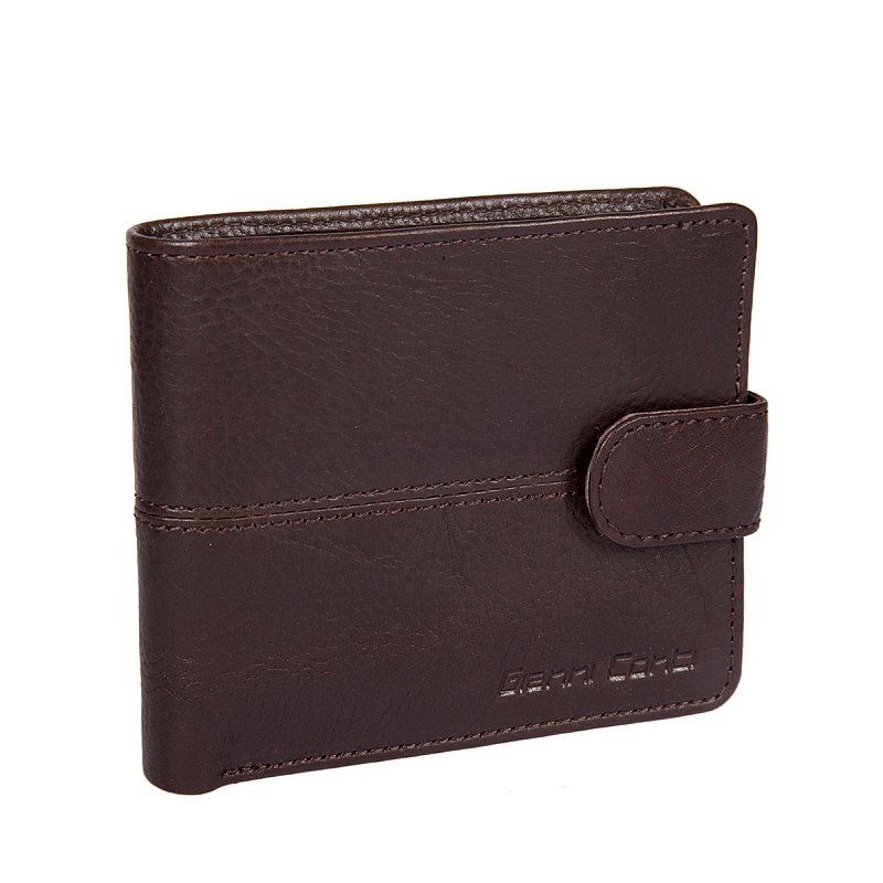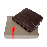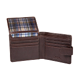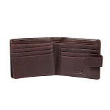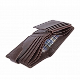 Внутри портмоне три отделения для купюр, девять кармашков для пластиковых карт, два потайных кармашка и сетчатый карман. Закрывается клапаном на кнопке.