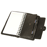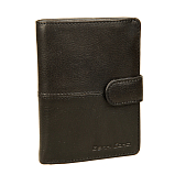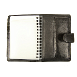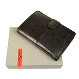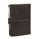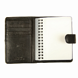 Внутри портмоне два отделения для купюр и блок, состоящий из десяти прозрачных файлов, файла для водительского удостоверения и файла для листов формата А5. На правой внутренней стороне расположен карман для монет на кнопке, в котором имеется карман для SIM-карты. На левой пять кармашков для пластиковых карт и потайной карман. Закрывается клапаном на кнопке.