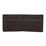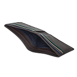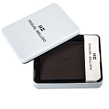 Портмоне раскладывается пополам, внутри два отделения для купюр, два потайных кармана, шесть кармашков для пластиковых карт. Оснащено RFID-защитой, что позволяет защитить банковские карты от считывания. Упаковано в подарочную жестяную коробку.