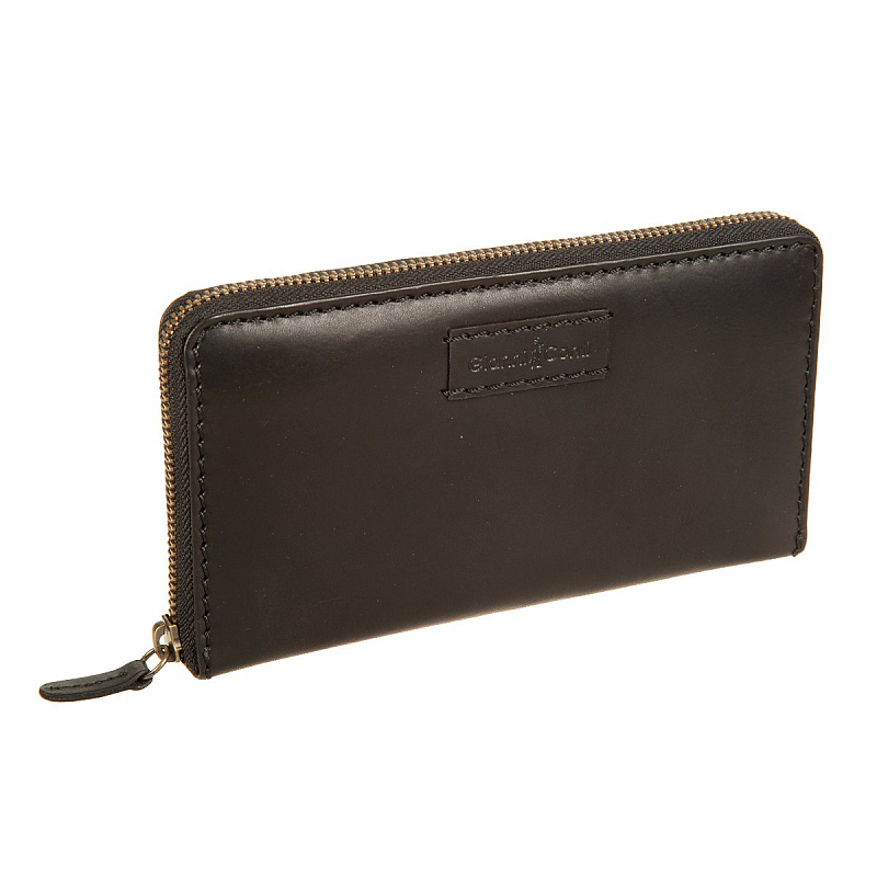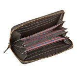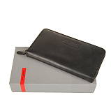 Внутри четыре отделения для купюр, карман для монет на кнопке, два кармана для документов и восемь кармашков для пластиковых карт. Закрывается на молнию по периметру.