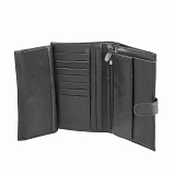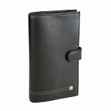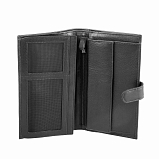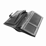 Внутри одно отделение для купюр, карман для монет на кнопке, карман на молнии, три кармана для документов, семь кармашков для пластиковых карт и три сетчатых кармана. Закрывается клапаном на кнопке.