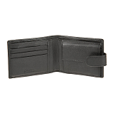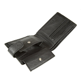 Внутри три отделения для купюр, одно из которых на молнии, карман для монет на кнопке, четыре потайных кармана и три кармашка для пластиковых карт. Закрывается клапаном на кнопке.