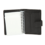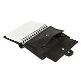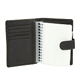 Внутри блок, состоящий из десяти прозрачных файлов, файла для водительского удостоверения и файла для документов формата А5. На внутренних стенках расположены пять кармашков для пластиковых карт, потайной карман и карман для монет на кнопке, в котором имеются два кармашка для SIM-карт. Закрывается клапаном на кнопку.