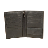 Внутри два отделения для купюр, карман для монет на кнопке, карман на молнии и шестнадцать кармашков для пластиковых карт.
