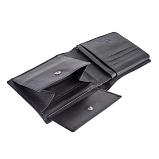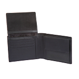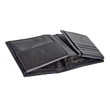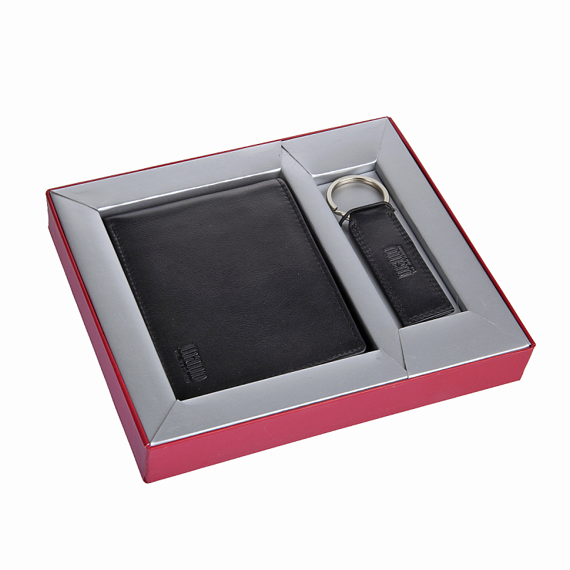 Набор состоит из портмоне и брелока. Внутри портмоне два отделения для купюр, карман для монет на кнопке, потайной карман, четыре кармана для документов, сетчатый карман и восемь кармашков для пластиковых карт. Размер портмоне 10 х 12.5 х 3 см. Брелок оснащён кольцом для ключей, размер 10,5 х 3 см.