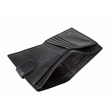 Внутри три отделения для купюр, одно из которых на молнии и десять кармашков для пластиковых карт. Закрывается клапаном на кнопке.