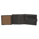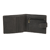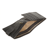 Внутри два отделения для купюр, карман для монет на молнии, два потайных кармана, сетчатый карман и десять кармашков для пластиковых карт. Закрывается клапаном на кнопке. Имеет защитный слой от считывания карт RFID-Protection.