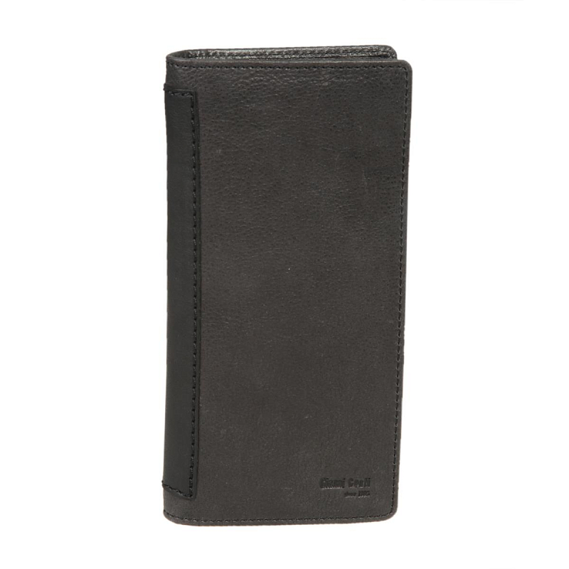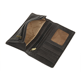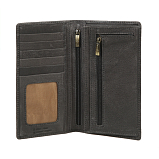 Раскладывается пополам. Внутри один отдел для купюр, отделение для мелочи на молнии, три кармана для документов, потайной карман на молнии, пять кармашков для пластиковых карт, сетчатый карман. Имеет RFID Protection (защитный слой от считывания карт)
