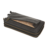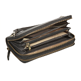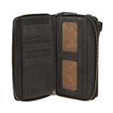Разделено на два отдела оба закрывается на молнию. Внутри в первом отделе девять кармашков для пластиковых карт, три потайных кармана, карман для документов, сетчатый карман. Во втором отделе четыре отдела для купюр, отделение для мелочи на молнии, два сетчатых кармашка, два кармана для документов, восемь кармашков для пластиковых карт. Снаружи на задней стенке карман на молнии. Оснащено съёмным ремешком на запястье на карабине. Имеет RFID Protection (защитный слой от считывания карт)