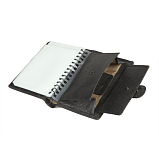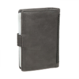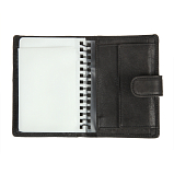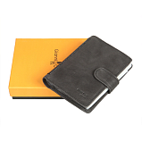 Внутри два отделения для купюр, карман для монет на кнопке, карман для документов, пять кармашков для пластиковых карт и блок, состоящий из десяти прозрачных файлов, файла для водительского удостоверения и файла для документов формата А5. Закрывается клапаном на кнопке. Имеет защитный слой от считывания карт RFID-Protection.
