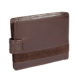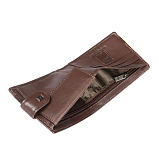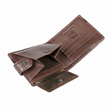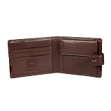 Внутри два отделения для купюр, одно из которых на молнии, карман для монет на кнопке, два потайных кармашка, кармашек для SIM-карты и три кармашка для пластиковых карт. Закрывается клапаном на кнопке.