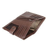 Внутри два отделения для купюр, карман на молнии, шесть карманов для документов, сетчатый карман и десять кармашков для пластиковых карт. Закрывается клапаном на кнопке. Имеется дополнительный вкладыш-обложка для паспорта размером 10 х 14 х 2 см. Левое поле обложки — пластик шириной 5 см, правое поле — натуральная кожа шириной 6,7 см c тремя карманами для документов.