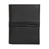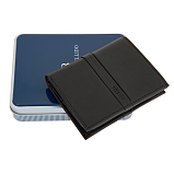 Портмоне раскладывается пополам, внутри два отделения для купюр, два потайных кармана, пять кармашков для пластиковых карт, сетчатое отделение для пропуска, отделение для мелочи на кнопке. Оснащено RFID-защитой, что позволяет защитить банковские карты от считывания. Упаковано в подарочную жестяную коробку.