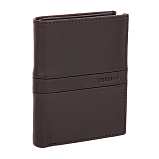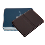 Портмоне раскладывается пополам, внутри два отделения для купюр, два потайных кармана, пять кармашков для пластиковых карт, сетчатое отделение для пропуска, отделение для мелочи на кнопке. Оснащено RFID-защитой, что позволяет защитить банковские карты от считывания. Упаковано в подарочную жестяную коробку.