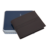 Портмоне раскладывается пополам, внутри отделение для купюр, три потайных кармана, шесть кармашков для пластиковых карт. Имеется съемный вкладыш с сетчатым карманом для пропуска и тремя отделениями для пластиковых карт. Оснащено RFID-защитой, что позволяет защитить банковские карты от считывания. Упаковано в подарочную жестяную коробку.