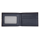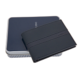 Портмоне раскладывается пополам, внутри два отделения для купюр, два потайных кармана, шесть кармашков для пластиковых карт, сетчатое отделение для пропуска. Оснащено RFID-защитой, что позволяет защитить банковские карты от считывания. Упаковано в подарочную жестяную коробку.