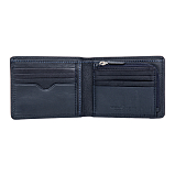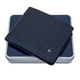 Мужское портмоне из натуральной кожи, раскладывается пополам, внутри отделение для купюр, три потайных кармана, восемь кармашков для пластиковых карт. Карман для мелочи на молнии. Оснащено RFID-защитой, что позволяет защитить банковские карты от считывания. Упаковано в подарочную жестяную коробку.
